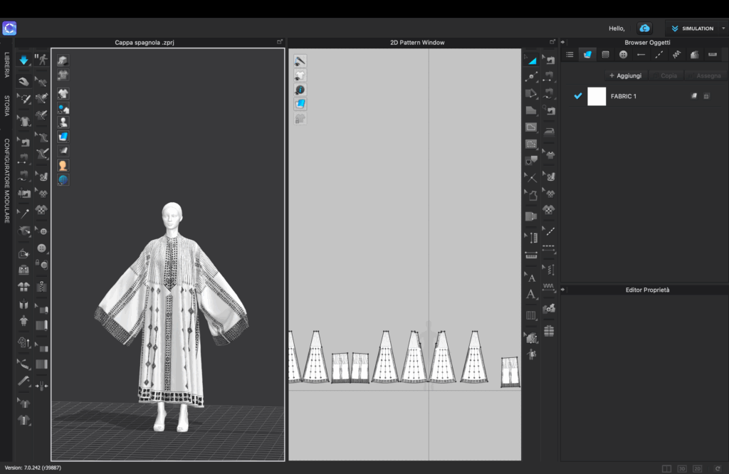 The digitalisation phase was carried out using Clo3D. The groups imported and organised the pattern pieces, added technical details such as notches, folds, and elastics, and adapted an avatar with the appropriate body measurements. The simulation and rendering were optimised, and snapshots were created for technical presentation purposes.
