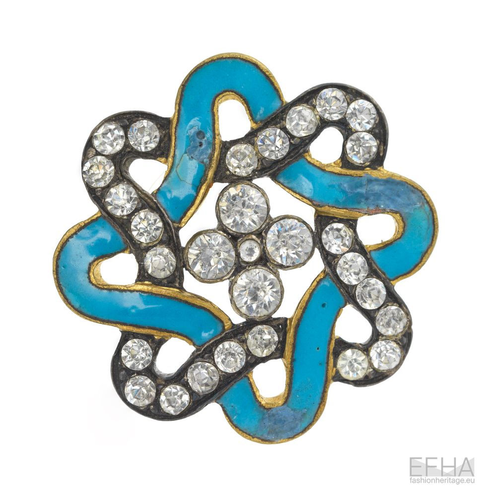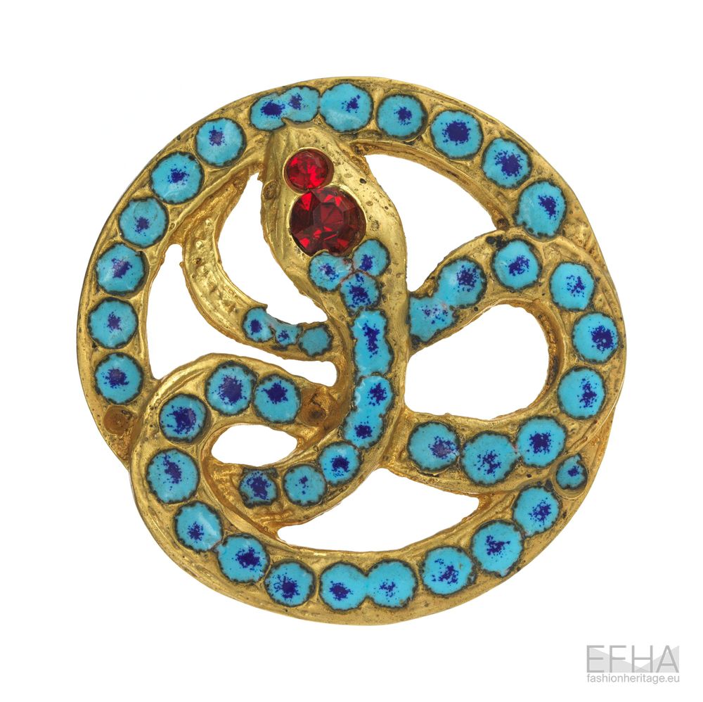 In contrast to this tactile exploration of surface, goldsmith François Hugo brought a more refined and ornamental approach to his collaborations with Elsa Schiaparelli. Part of his buttons for Schiaparelli are distinguished by their intricate detailing and refined use of materials. One example features a button with a six petal flower painted in white enamel, centered with a royal blue rhinestone, each petal edged with three small rhinestones and connected by a circular garland painted in black enamel. Another button presents two intertwined ribbons in a square pattern, the first painted with turquoise enamel and the second adorned with sparkling white rhinestones, all held together by four large rhinestones of a similar design. A circular button featuring a twisted gold metal band shaped like a snake, set with turquoise stones and with two red rhinestones at the head is another example.