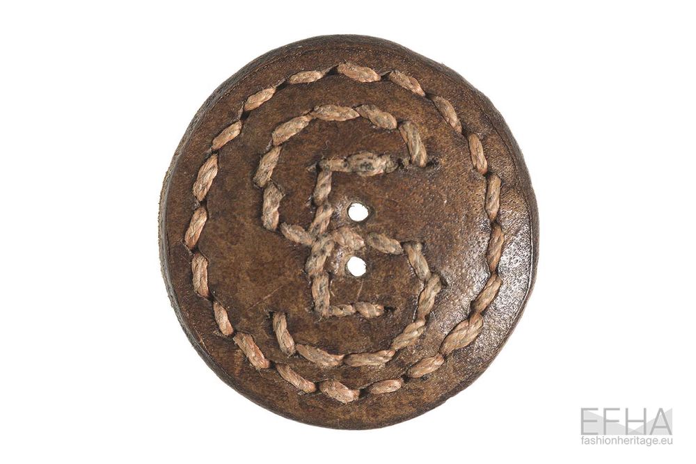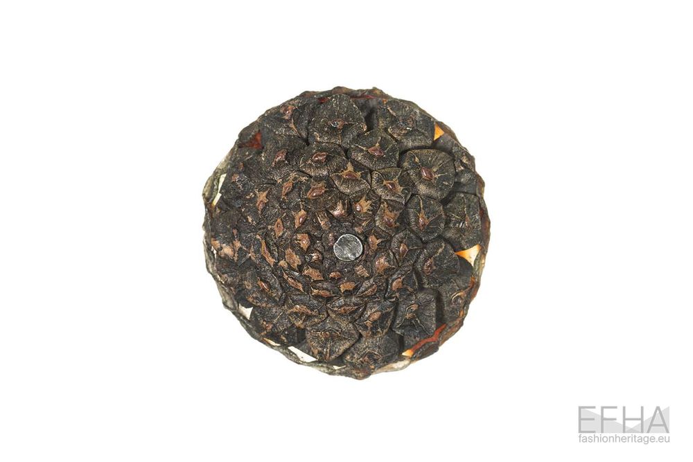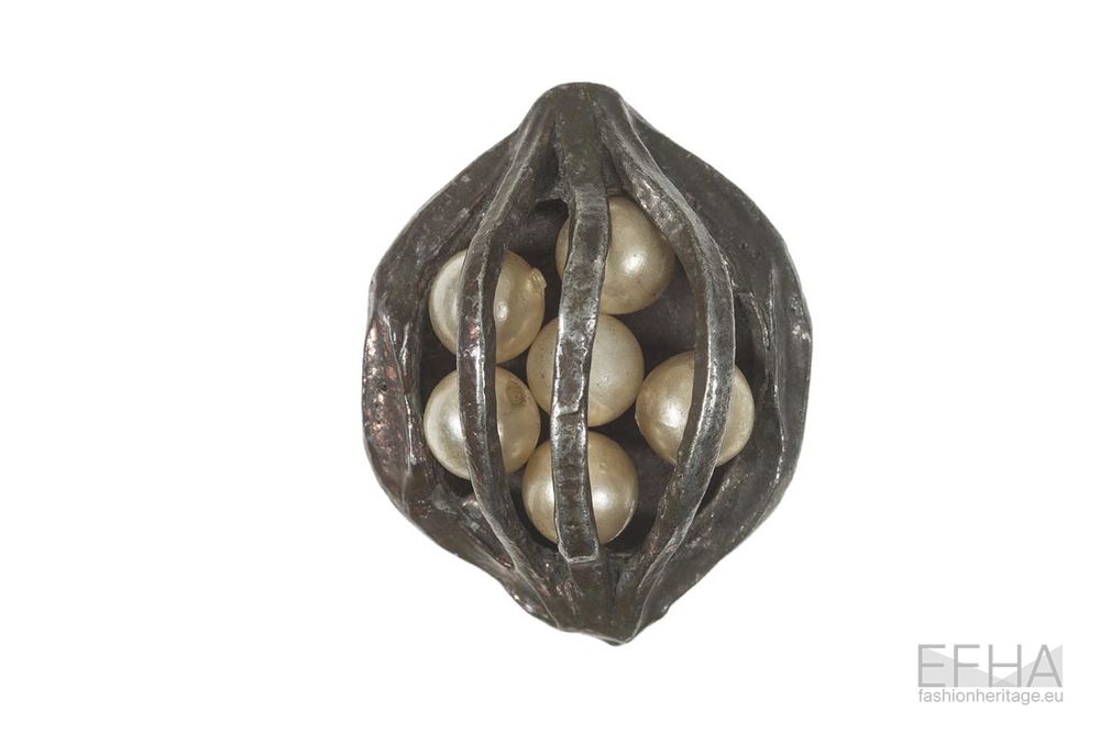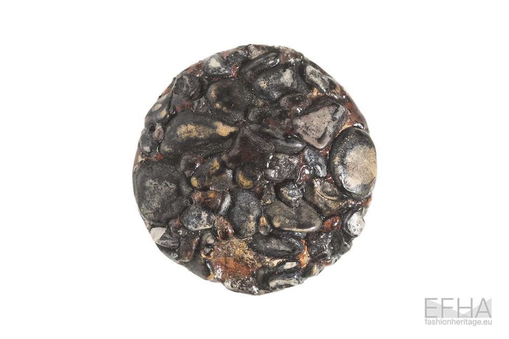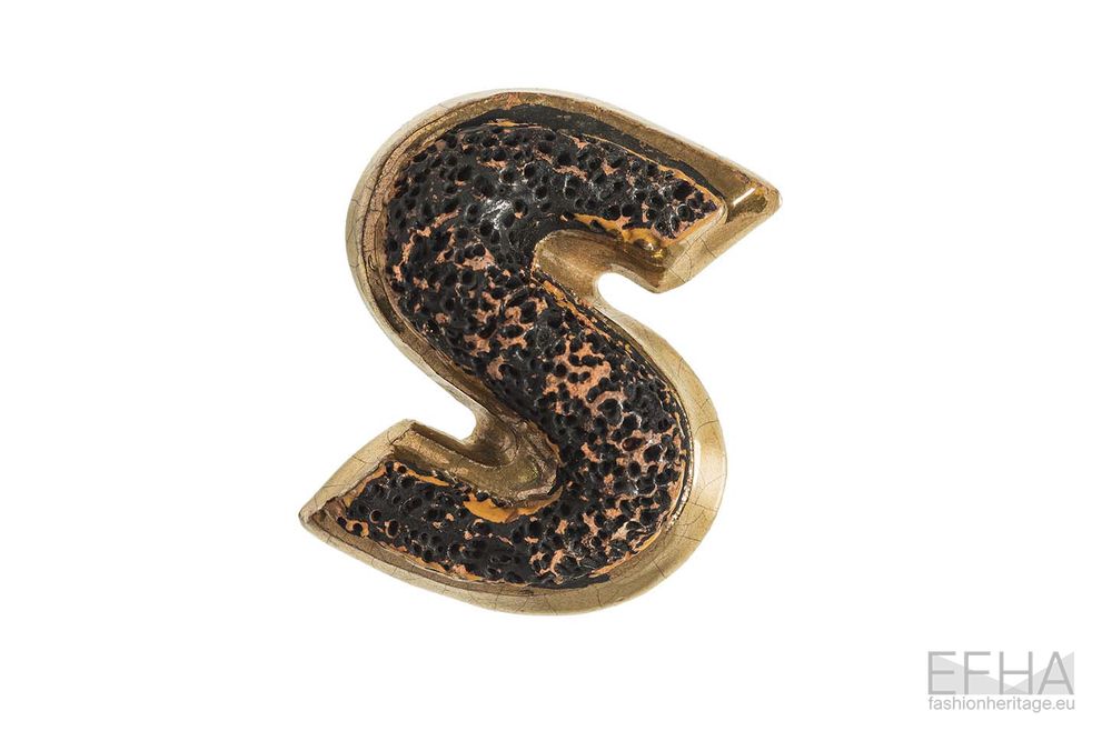 While Schlumberger explored these qualities mostly through intricate metal work, Jean Clément approached them through a more tactile and surface-oriented lens in his buttons for Elsa Schiaparelli. Working with materials such as leather, resin and terracotta, he is able to create buttons with rich textured compositions. One example is the form of the letter “S”, with its surface densely pitted and irregular, creating a contrast between the defined outline and its rough interior. Another button presents a compact circular cluster of pebble-like elements, closely packed to form a stone-like surface. A design shows what seems like the surface of a pine cone, with tightly clustered fragments that form a dense surface recalling this natural growth pattern. A simple yet interesting example is the one of a leather button with the letters “E” and “S” sewn around a circle.